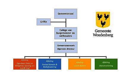 De gemeentelijke organisatie wordt aangestuurd door een vierkoppig managementteam, bestaande uit de gemeentesecretaris en drie managers. Zij sturen ieder één afdeling aan, bestaande uit verschillende teams. Deze vier afdelingen zijn: